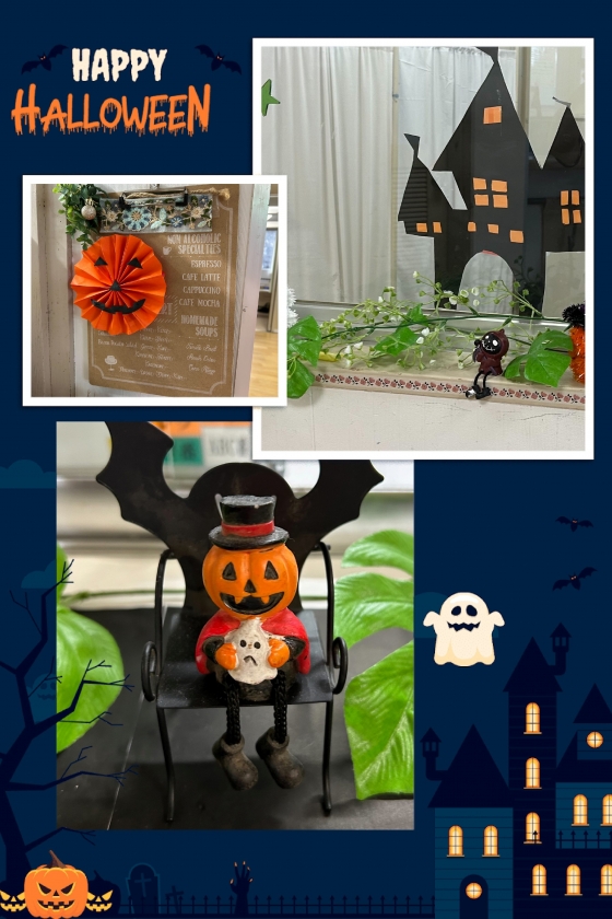 10月は比較的新しく、世間でも賑わうようになったHalloweenの飾りつけをしました。